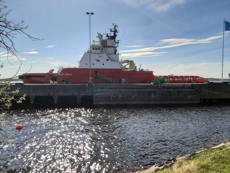 On se stationne à quelques kilomètres de là, sur un quai à Luleå, face à des bateaux brise glace.